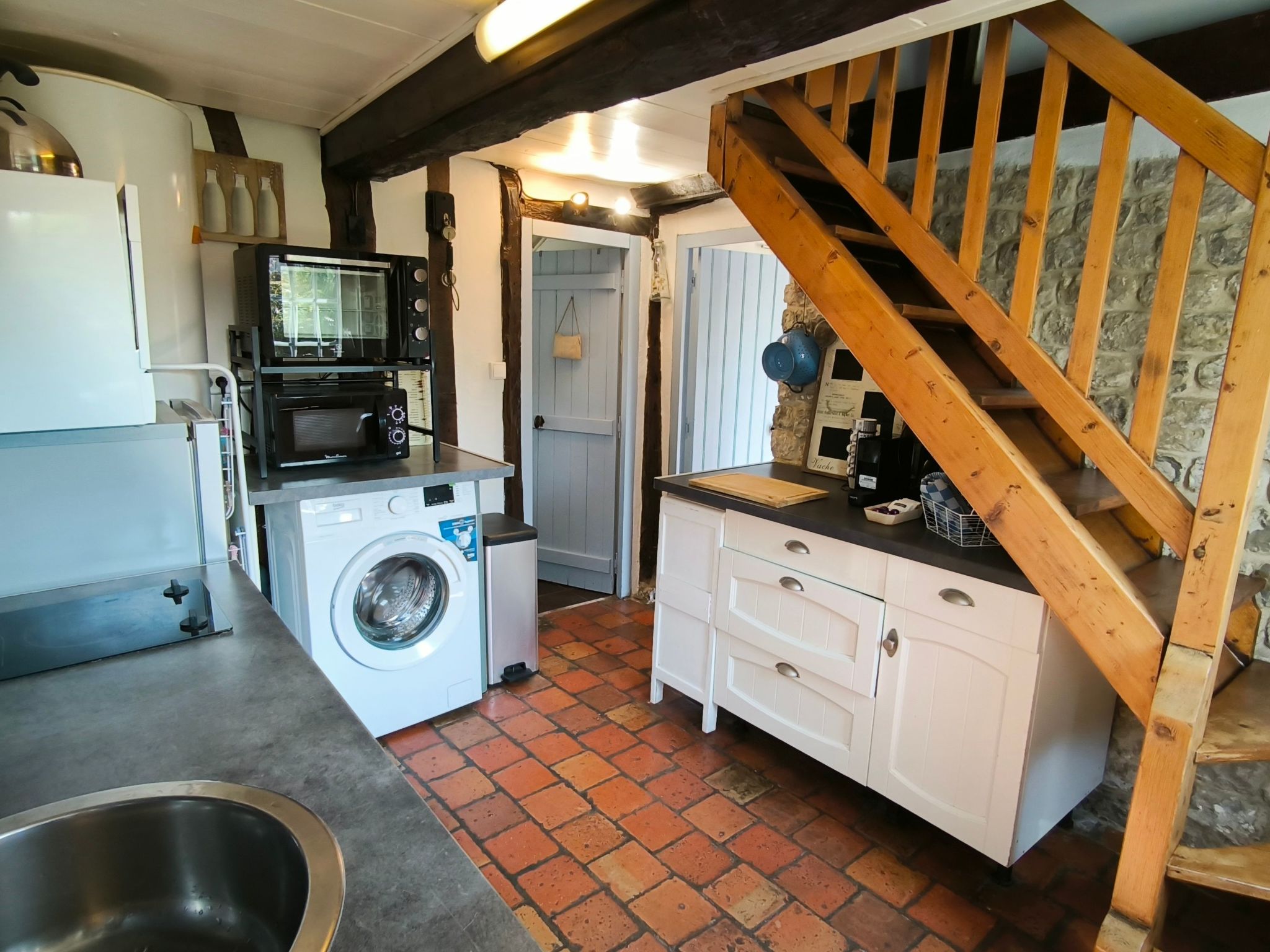 L'intérieur de ce havre de paix est aménagé pour votre confort et votre bien-être. Au rez-de-chaussée, vous trouverez un salon doté d'un canapé-lit double de 160cm, une salle à manger, une cuisine séparée entièrement équipée avec un petit lave-vaisselle de 6 couverts, une plaque de cuisson électrique à 2 feux, un four plus un micro-ondes, un mini-four et une cafetière. La maison dispose également d'une petite salle d'eau avec douche, lavabo, WC, et un sèche-cheveux. À l'étage mansardé se trouve le coin nuit avec un lit de 140 cm et un coin bureau, parfait pour vos moments de repos.